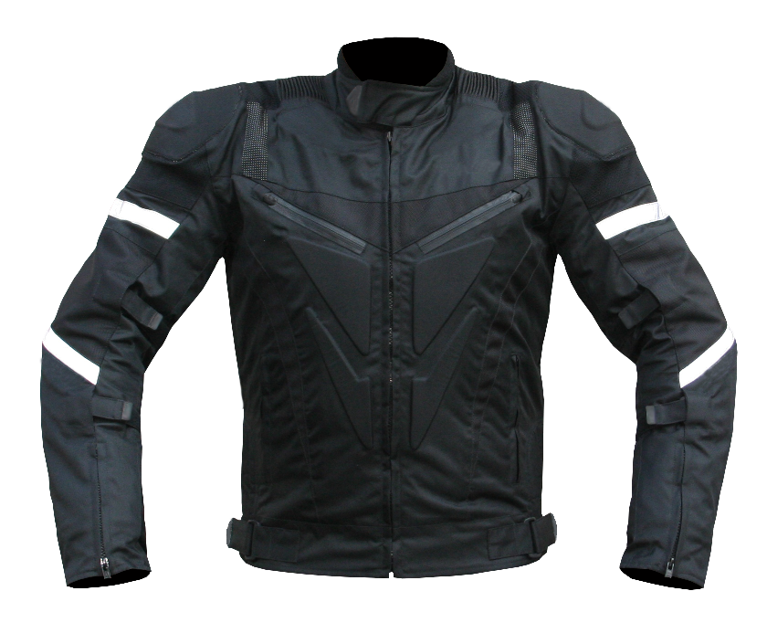 This armored black motorcycle jacket is built for riders who demand both safety and style. Featuring white reflective stripes on the upper arms for enhanced visibility, it includes padded sections on the shoulders, elbows, and forearms for impact protection. The front showcases a bold V-shaped design with zippered pockets and a high collar for wind resistance. Sleek and functional, this jacket is ideal for high-speed riding and urban commutes.