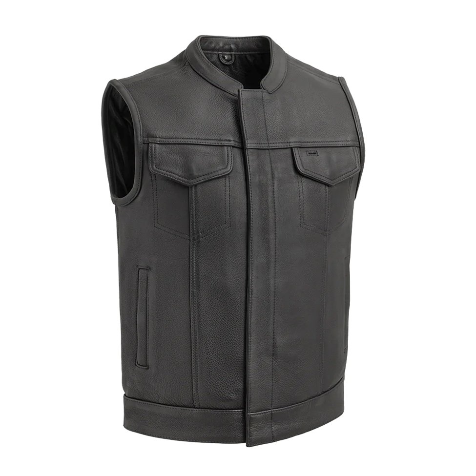 This black leather biker vest delivers rugged style and practical functionality. Featuring a sleeveless cut and a concealed front zipper closure, it offers a streamlined silhouette ideal for layering. The high collar adds a bold touch, while two flap chest pockets and two vertical side pockets provide ample storage. Crafted from durable leather, this vest is perfect for motorcycle riders and fashion enthusiasts seeking a tough, versatile look.